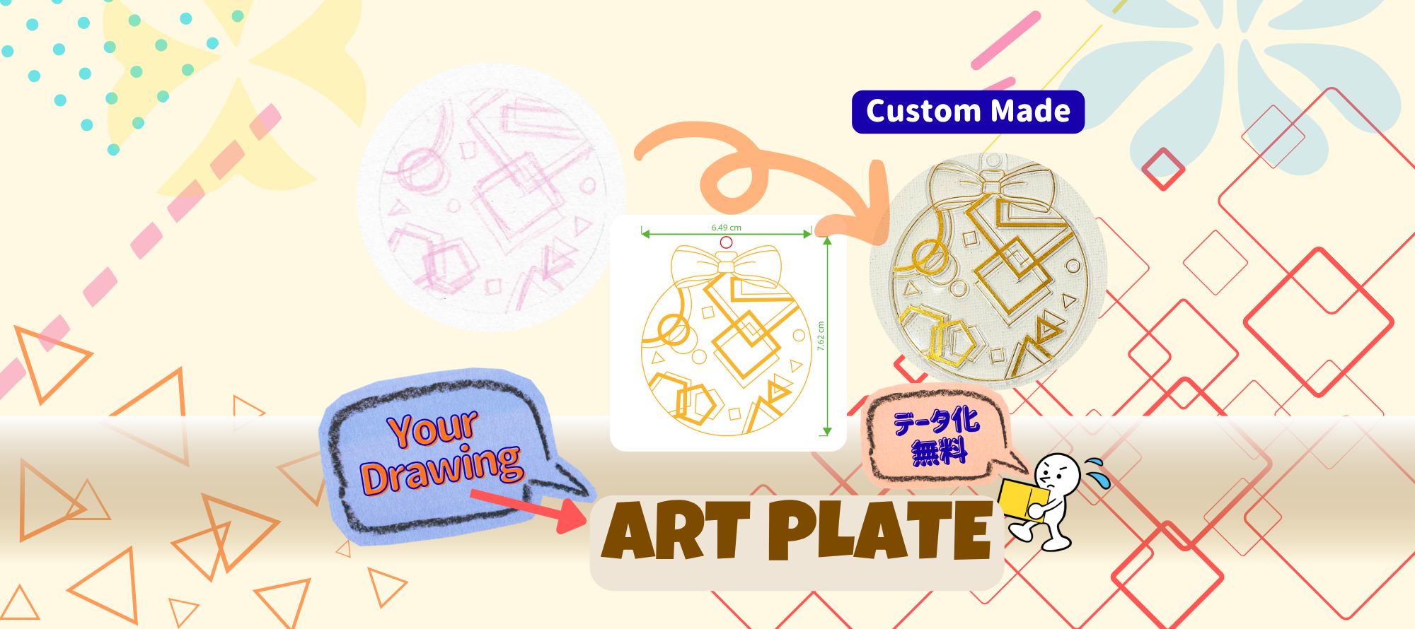 \すべて限定デザイン!/ 選べるアートプレート|1枚から購入OK このアートプレートは、当社オリジナル作品に加え、「シェアプラン」で作成されたすべてのオーダーメイドデザインを集めた、特別なコレクションです。 ご参加いただいた作家さまから販売許可をいただき、全種類を当社で販売しています。もちろん、どれも当社限定のデザインです! すべて日本国内で企画・デザインされており、おそろいで使ったり、イベントで並べたり、コレクションしたりと、楽しみ方は自由自在♪ 数量に限りがあるため、気になるデザインはお早めに。“世界にひとつ”の1枚と、出会ってみませんか? 作ってみたい方へ 「こんなプレートを作ってみたい!」というアイデア、大歓迎です!当社では、オーダーメイドでのデザイン制作・販売も行っています。お気軽にInstagramまたはお問い合わせフォームからご連絡ください♪