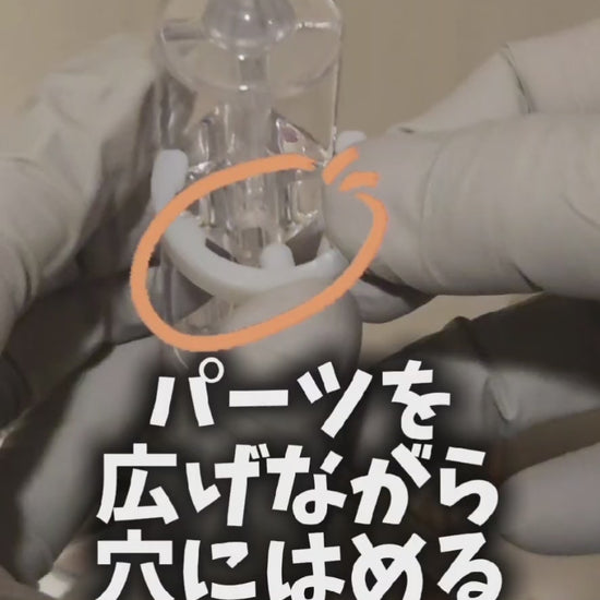 位置を決めるためのパーツは、突起物のついている方を上にして、ポールのサイドの穴に、パーツを広げながらハメます。詳しくは動画をご確認ください。